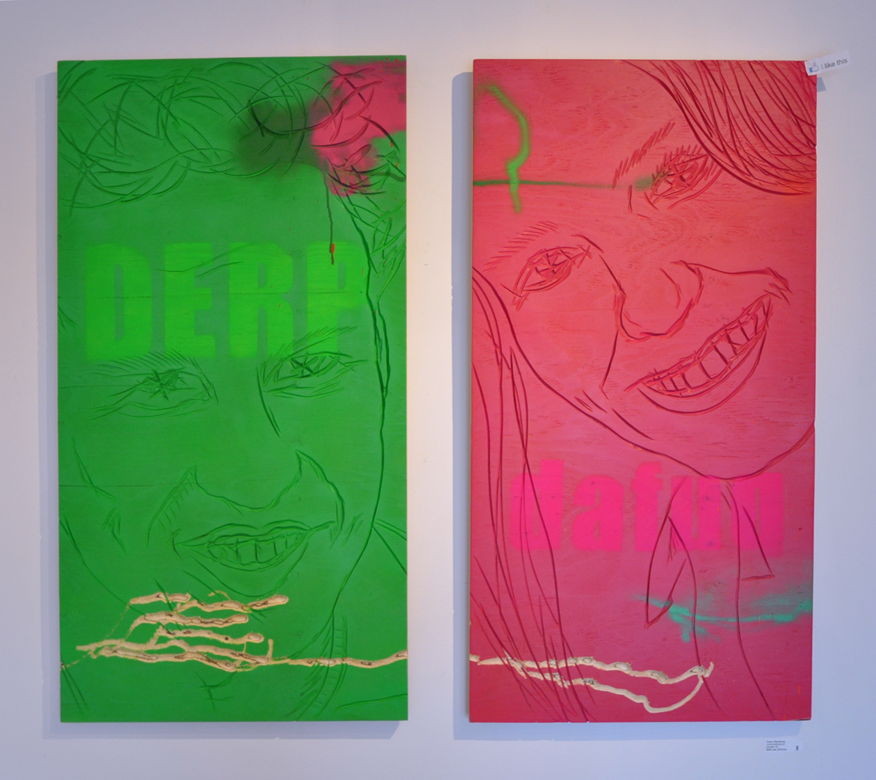 Pour l’exposition ‘No Memes No’, qui a eu lieu à la galerie HOT ART WET CITY de Vancouver, j’ai créé une deuxième, nouvelle pièce intitulée Double D. En m’inspirant du panneau qui a été sélectionné pour l’exposition, METOPE (5), que j’ai créé en 2012 en réponse aux différentes expositions post colonialistes qui faisaient surface à l’époque au Québec, j’ai voulu produire un diptyque qui continuait le dialogue puisqu’il y a eu un expo présenté par UNIT/PITT Projects qui abordait un sujet semblable ici à Vancouver.