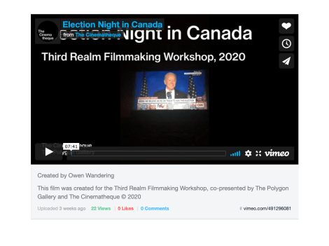 During a three-day filmmaking workshop hosted by both The Cinematheque (Vancouver) and The Polygon Gallery (North Van), participants were asked to conceive of, shoot, and edit a 3 minute (or longer) video, inspired by the exhibition Third Realm, which was shown in The Polygon Gallery spaces from September 4 to December 8, 2020. My piece drew on the political aspects of the show, and the different uses of media both traditional and contemporary, to put together a work examining the U.S. presidential election, but from a Canadian perspective.